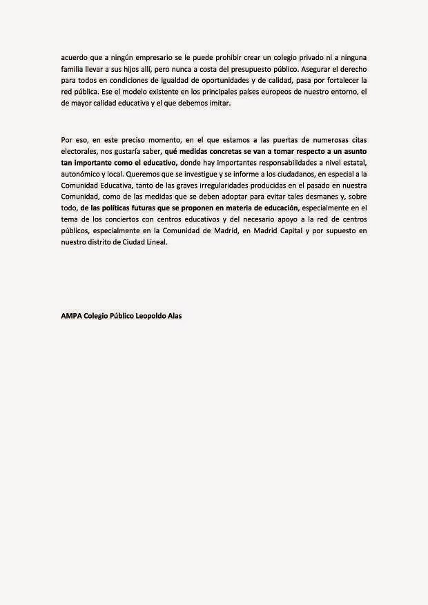 Nuestra intención era que esta carta llegase a ser leída por los futuros candidatos a la presidencia de la Comunidad de Madrid, por lo que la hemos hecho llegar a los partidos políticos con los que tenemos contacto. Esperamos que sean sensibles a nuestros problemas y se reflejen en las propuestas electorales.