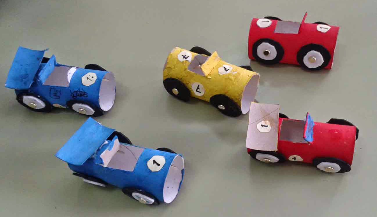Los hemos transformado en unos bonitos coches de carreras de colores brillantes, añadiendo ruedas con goma eva y encuadernadores, hemos pintado con témpera y pincel y los detalles los hemos ejecutado en cartulina y rotulador… Hemos aprendido lo que es una «plantilla de círculos» y la hemos utilizado para dibujarlos cómodamente (las ayudas de delineación siempre vienen bien…). Seguro que ya están corriendo por vuestras casas… Podéis encontrar más en HANDYMANIA.COM