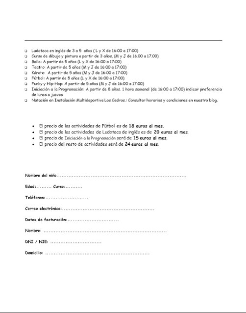 –Matrícula de actividades: 20 € por alumno y actividad.