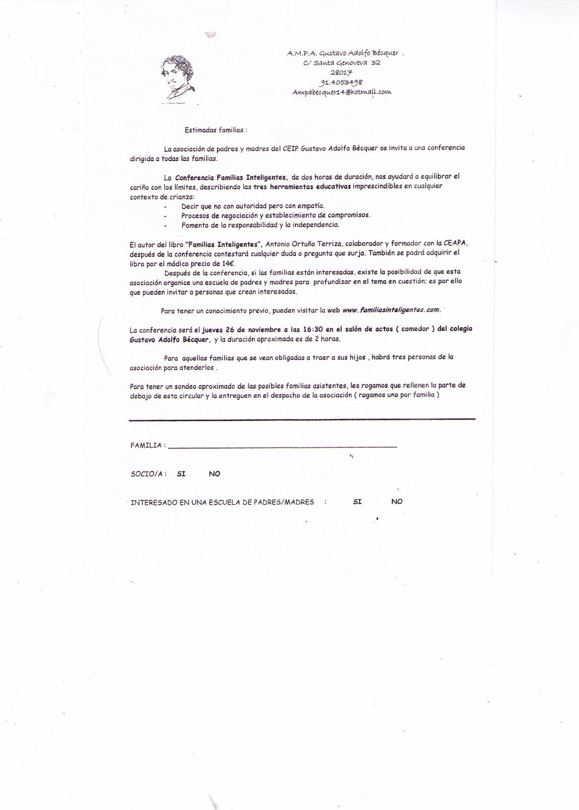 Sin categoríaCONFERENCIA FAMILIAS INTELIGENTES 23 noviembre, 2015 ampaleopoldo Estimadas familias, os hacemos llegar la información sobre una conferencia que se celebrará el próximo jueves en el CEIP Gustavo Adolfo Bécquer. Compártelo: Compartir en X (Se abre en una ventana nueva) X Comparte en Facebook (Se abre en una ventana nueva) Facebook Me gusta Cargando... Relacionado