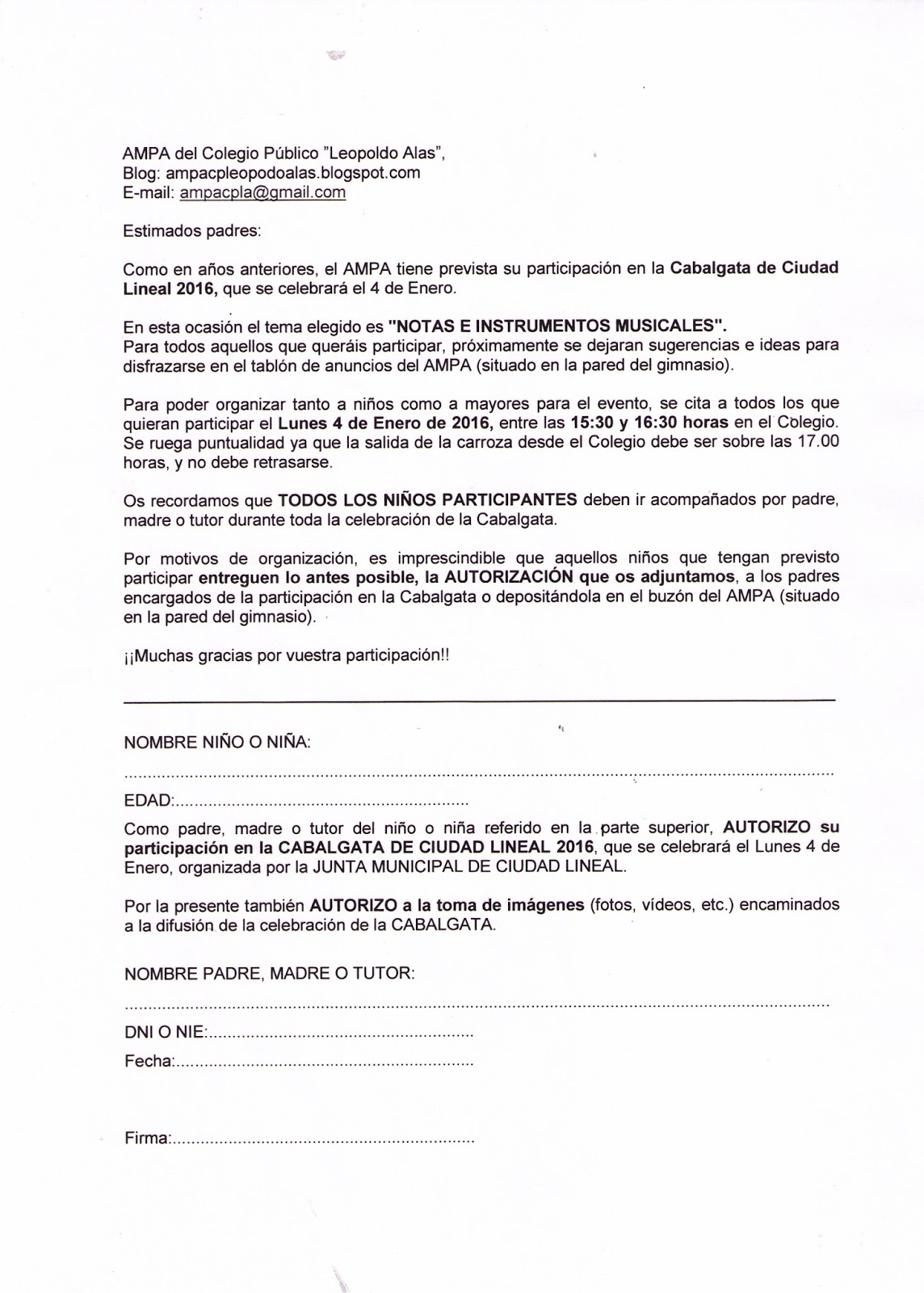 Os dejamos aquí la AUTORIZACIÓN que deben entregar aquellos niños que quieran participar en ella.