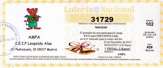Sin categoríaLOTERÍA DE NAVIDAD 27 noviembre, 2015 ampaleopoldo Estimadas familias: Como todos los años, hemos preparado la Lotería de Navidad. Si queréis comprar papeletas podéis pasar por el local del AMPA de lunes a jueves en nuestro horario habitual. ¡¡Mucha suerte!!. Compártelo: Compartir en X (Se abre en una ventana nueva) X Comparte en Facebook (Se abre en una ventana nueva) Facebook Me gusta Cargando... Relacionado
