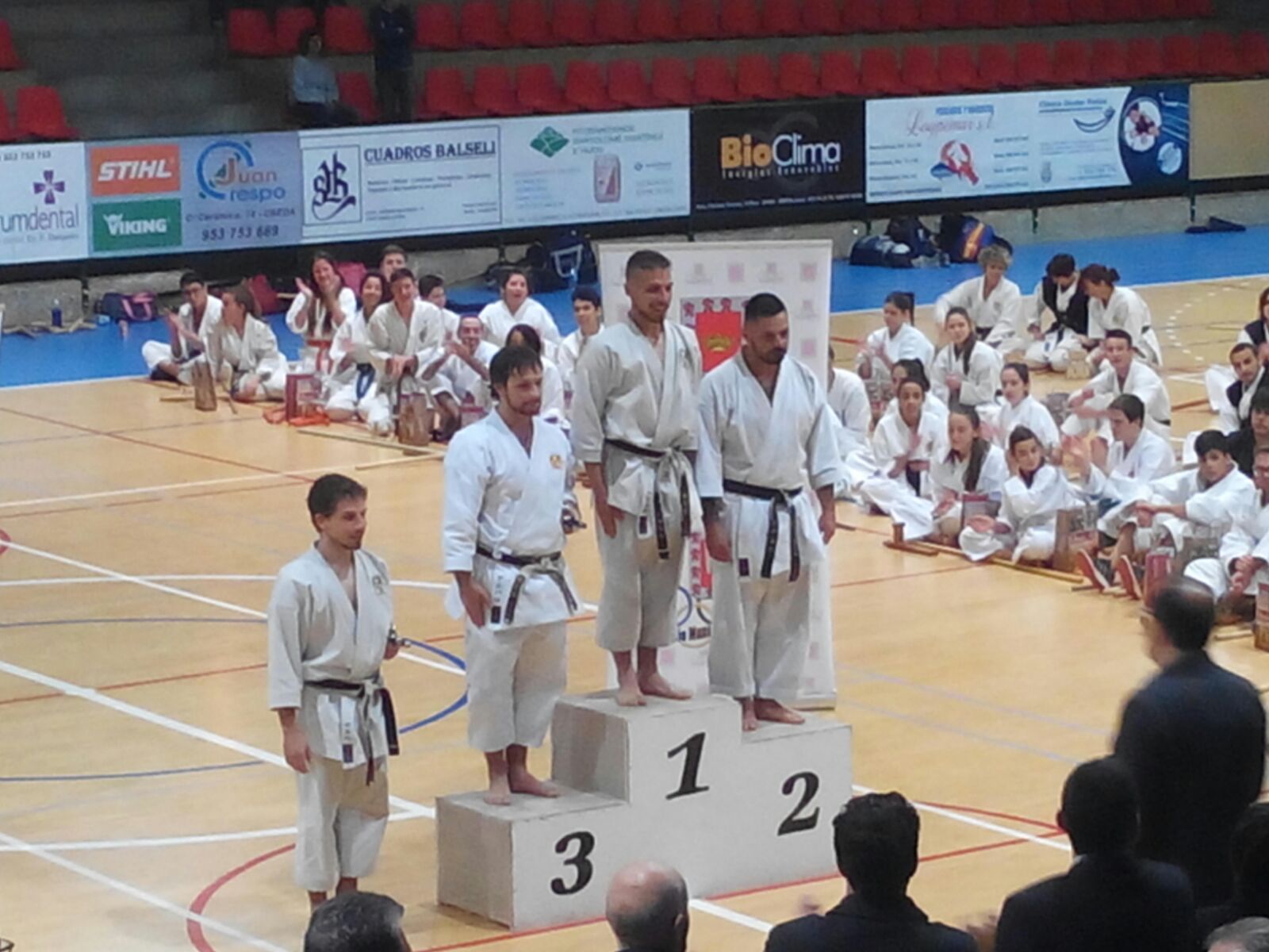 Aquí está con algunos de sus alumnos que también acudieron al campeonato y abajo está recibiendo el título de campeón: