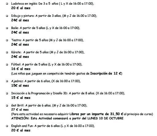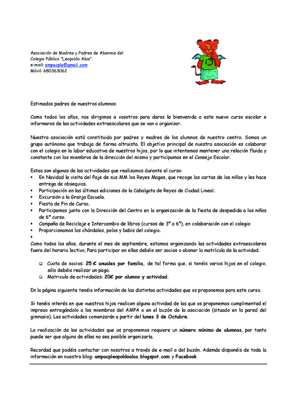 Sin categoríaACTIVIDADES EXTRAESCOLARES 2016-2017 26 septiembre, 2016 ampaleopoldo Estimadas familias, ya tenemos preparada la hoja para inscribir a los niños en las actividades, que adjuntamos a continuación por si acaso no os ha llegado a casa… ¡¡Comenzamos la temporada!! Precios y horarios de las Actividades Extraescolares: Compártelo: Compartir en X (Se abre en una ventana nueva) X Comparte en Facebook (Se abre en una ventana nueva) Facebook Me gusta Cargando... Relacionado