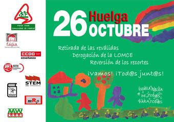 Desde la FAPA Giner de los Ríos y la Plataforma para la Escuela Pública de Ciudad Lineal nos llega información sobre la convocatoria de la huelga del 26 de Octubre, sobre la que ya habréis oído alguna noticia. Os dejamos la convocatoria… ¡¡Muchas gracias!!