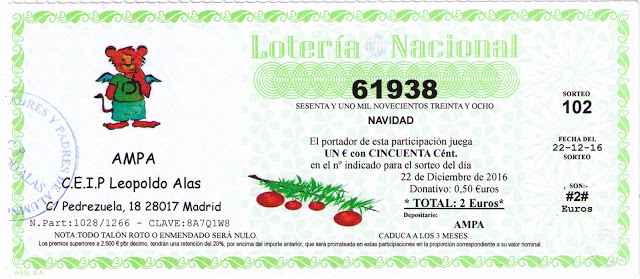 Os recordamos que, como todos los años, tenemos a vuestra disposición la LOTERÍA DEL AMPA, para el Sorteo de Navidad.