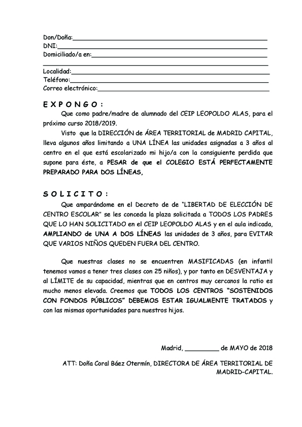 Os dejamos una QUEJA QUE PUEDEN FIRMAR TODOS LOS PAPÁS y MAMÁS DEL COLE QUE LO DESEEN… El AMPA tiene previsto entregar todas aquellas que nos hagáis llegar, aunque también podéis entregarlas vosotros mismos, sin problema. Únicamente os pediríamos que nos hicieséis llegar copia, para poder tener conocimiento de cuántas quejas se han enviado a la Dirección de Área…