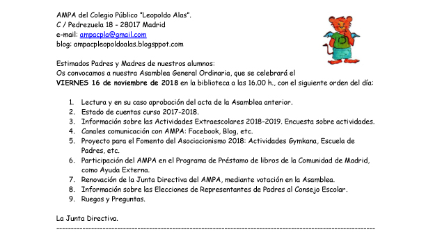 Sin categoríaASAMBLEA ANUAL ORDINARIA AMPA 2018 13 noviembre, 2018 ampaleopoldo Os dejamos la convocatoria de la Asamblea Anual del AMPA, en la que constan los puntos del día: Esperamos vuestra asistencia. Compártelo: Compartir en X (Se abre en una ventana nueva) X Comparte en Facebook (Se abre en una ventana nueva) Facebook Me gusta Cargando... Relacionado