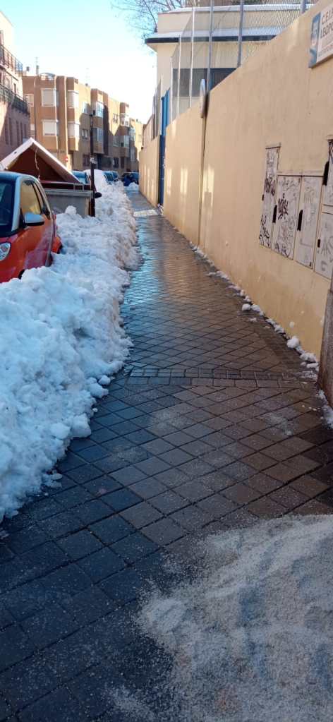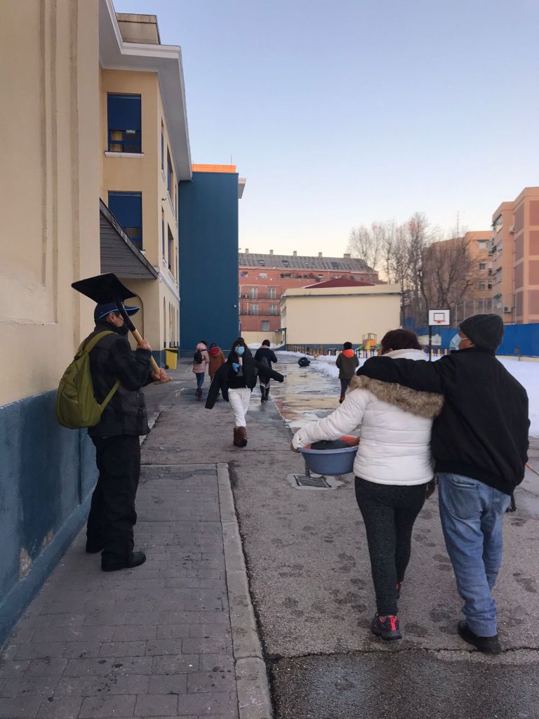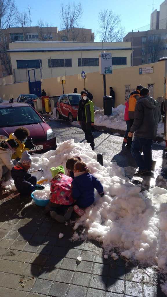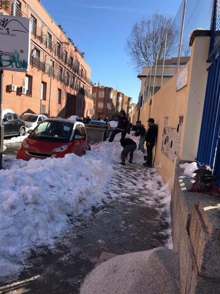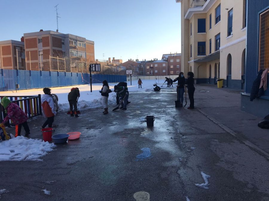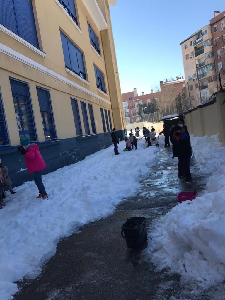 El sábado 16 de enero la suma de familias (padres y madres, niños y niñas), equipo directivo, maestros y maestras y Asociación Vecinal de La Elipa, hizo posible que todos los accesos y un amplio espacio en el patio del Leopoldo, quedasen libres de nieve y hielo para poder volver a las aulas con seguridad frente al Covid-19.
