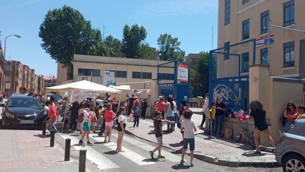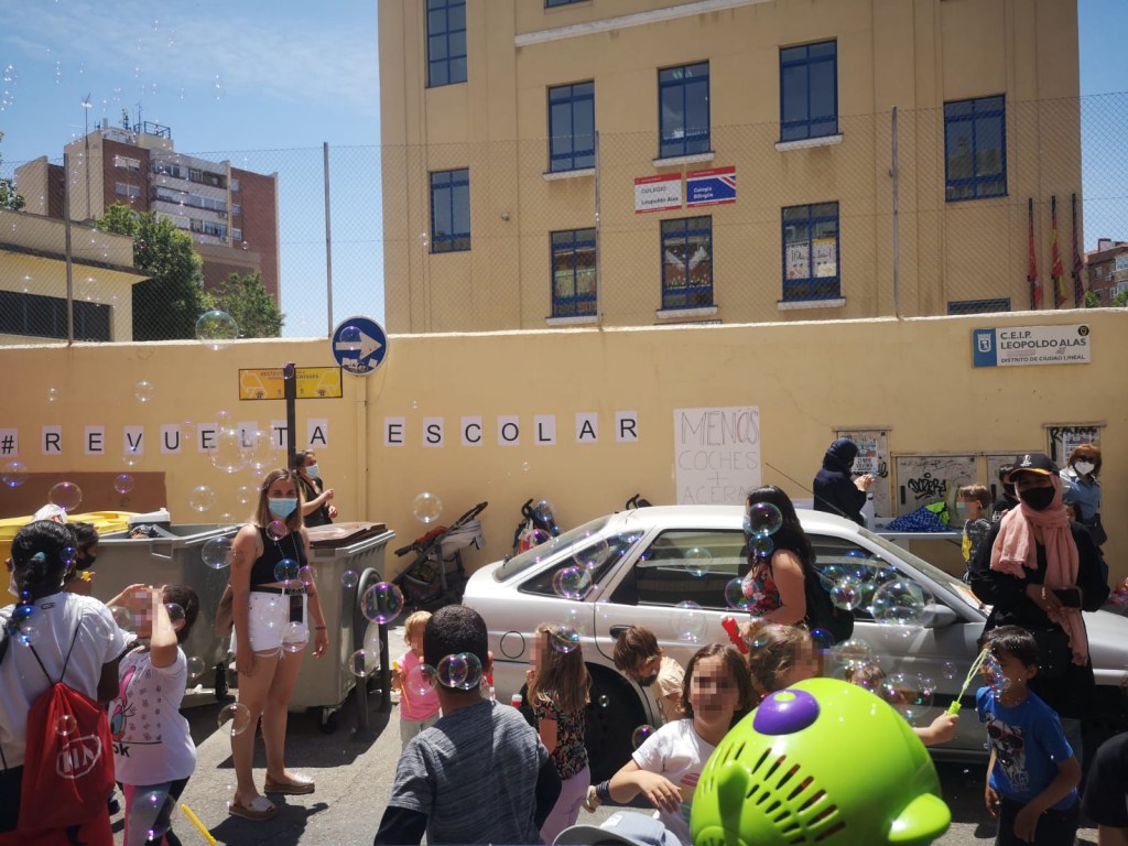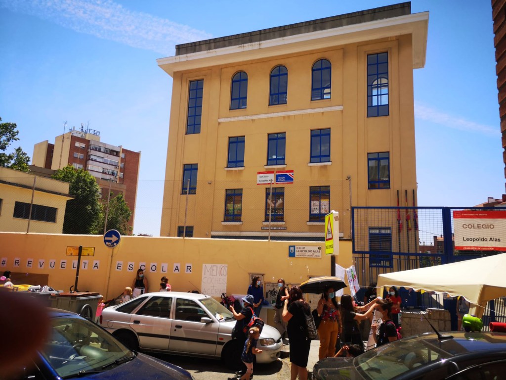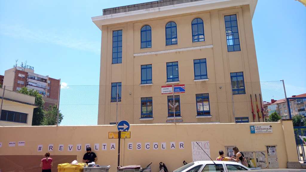 Un viernes sí y uno no, y ya van dos. Que viva la Revuelta Escolar. Las familias del CEIP Leopoldo Alas volvemos a plantarnos delante del cole para pedir a las administraciones públicas cosas muy básicas: más espacio, seguridad, árboles, bancos, aparcabicis… Que nuestros carritos de bebé puedan llegar sin obstáculos hasta la puerta del colegio, que no nos atropellen esperando a nuestras hijas, que llegar al colegio no sea una tortura multisensorial (ruidos, farolas en la acera, humos y olor a basuras) sino un paseo agradable.
