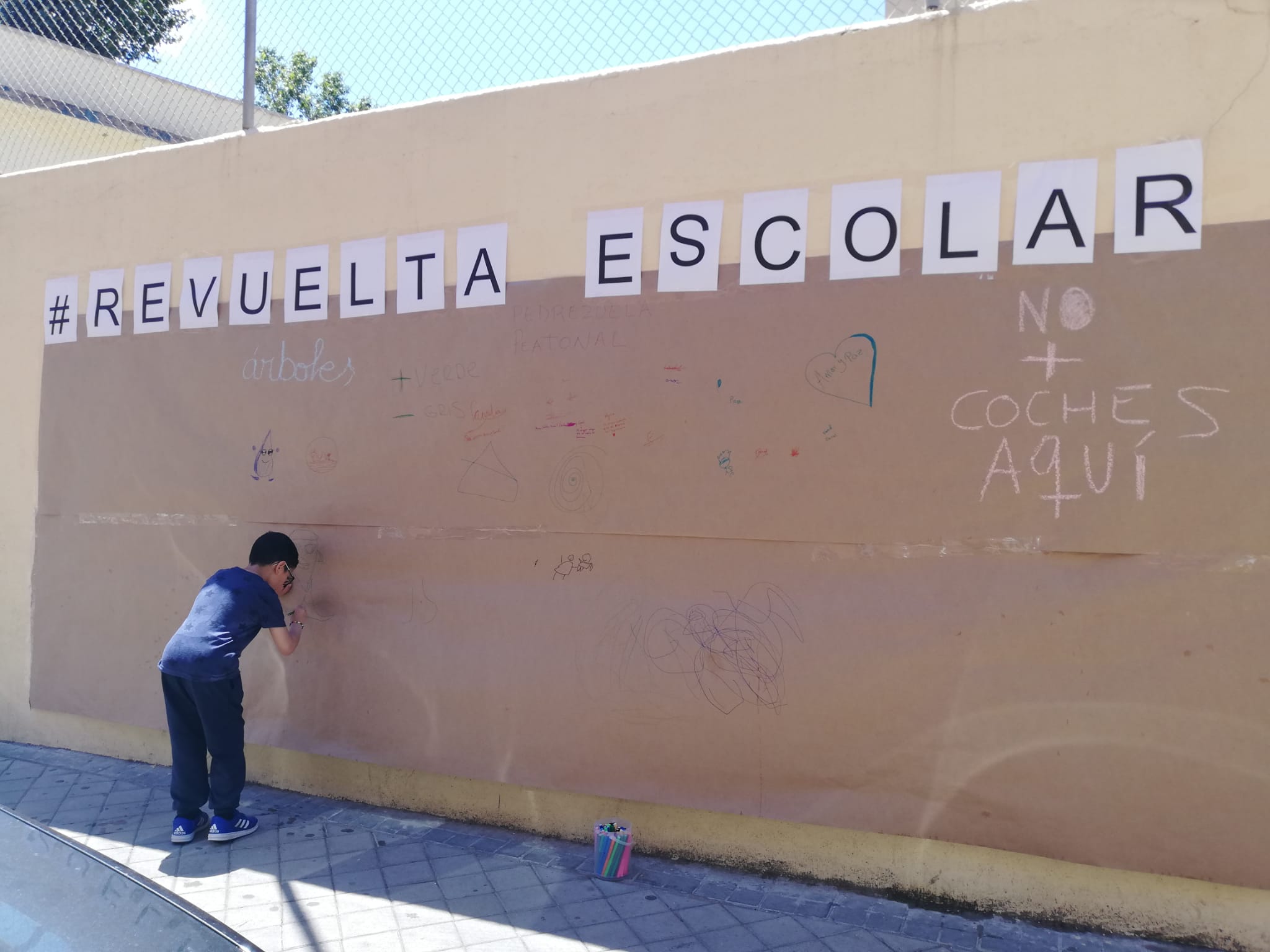 Es curioso cómo interiorizamos la precariedad. Para decorar y preparar los carteles y para colgar las telas donde se puede leer «un entorno escolar seguro», hay que esquivar tres gigantescos contenedores repletos de basura, meternos de costado entre los coches para asegurar la pérgola, amarrar los vientos en las vacas y retrovisores de los coches aparcados.