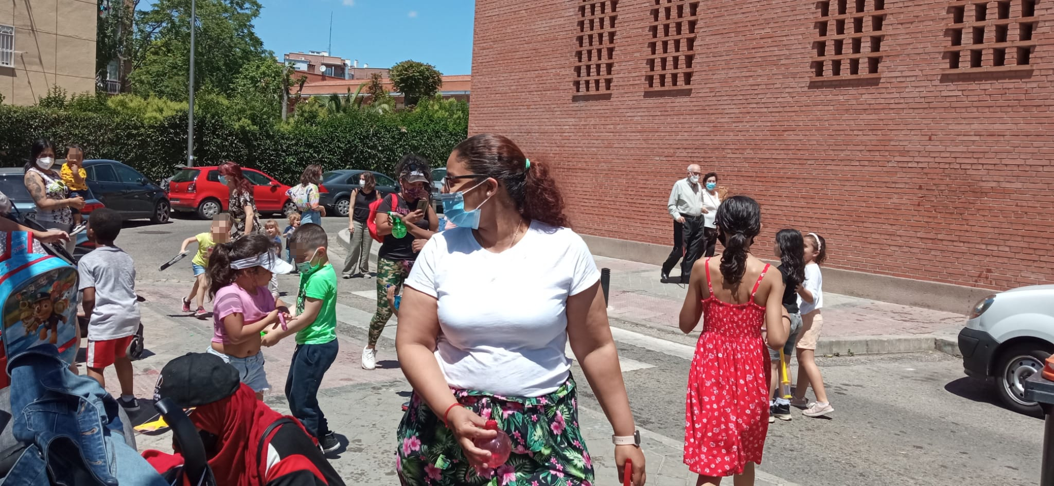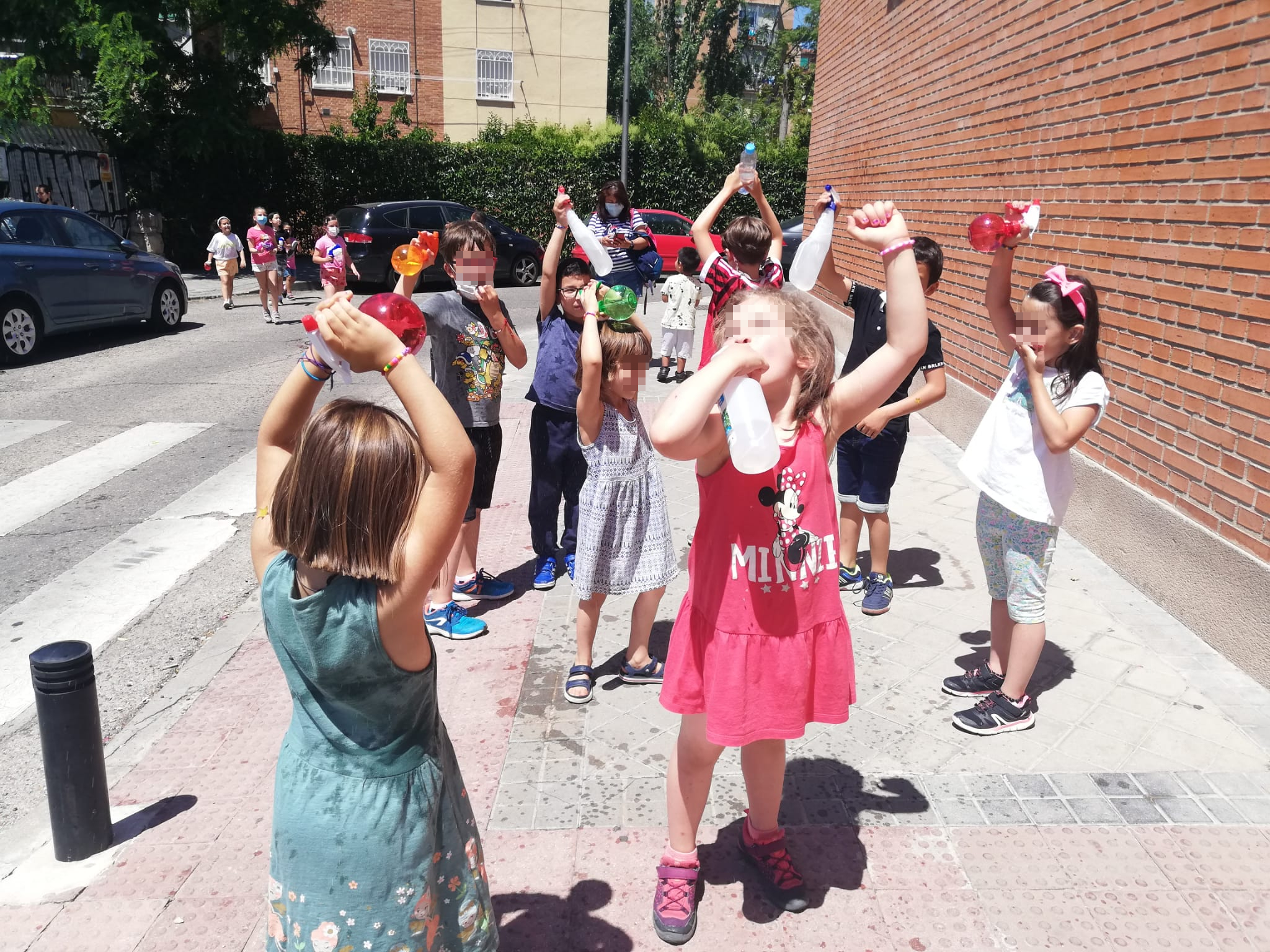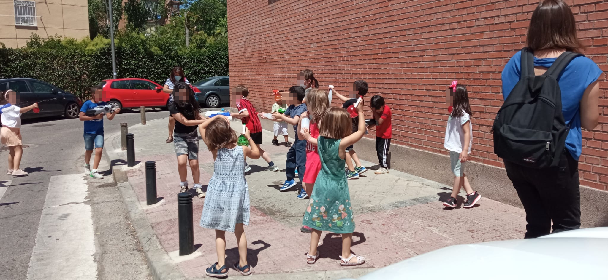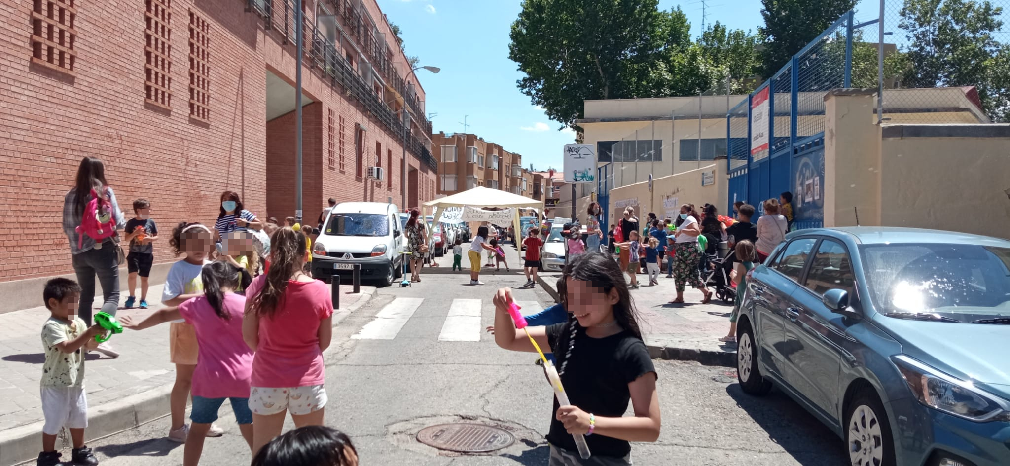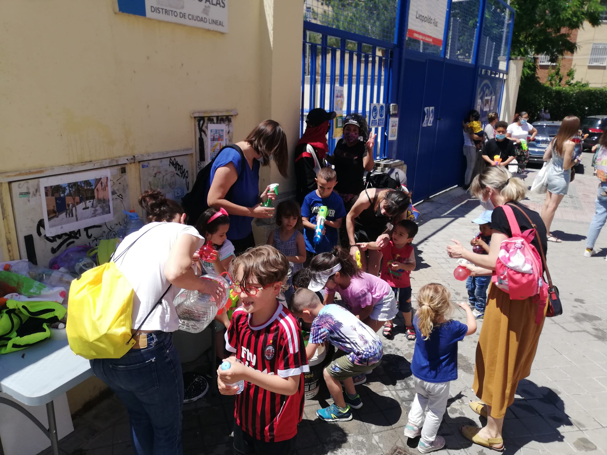 Calles limpias y amplias, árboles, bancos donde sentarse a la sombra, aceras transitables… Lo que pedimos cae por su propio peso. En otros distritos se ha solucionado en los últimos años. Delante de otros colegios de Ciudad Lineal se han cerrado calles al tráfico. Aquí no y eso lo saben las decenas de familias se han quedado a la salida y otras decenas que no han podido venir porque trabajan. Los niños y niñas venían con sus juguetes de agua cargados, listos para la batalla. Al final no ha quedado nadie sin mojarse. Bueno sí, la Policía Municipal, que desde la lejanía ha cumplido su trabajo cortando la calle 45 minutos a la altura del López Ybar.